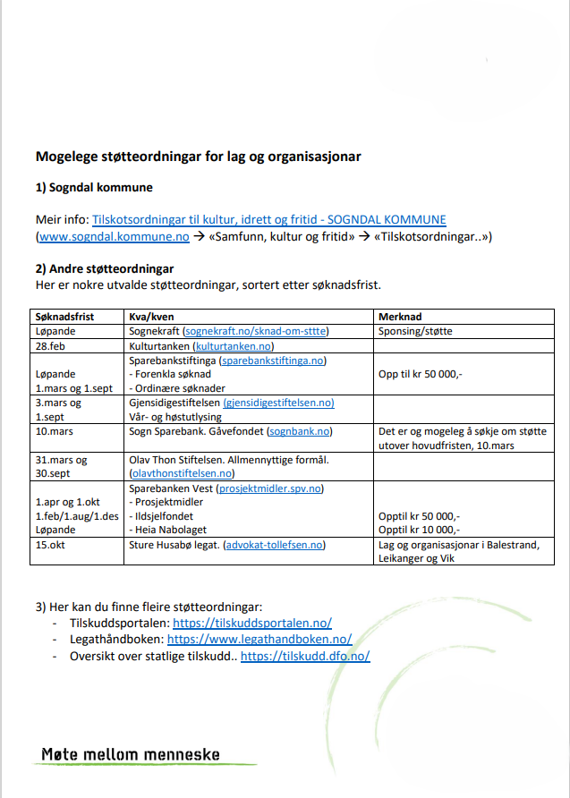 Her finn du ei enkel oversikt over aktuelle støtteordningar for lag og organisasjonar.